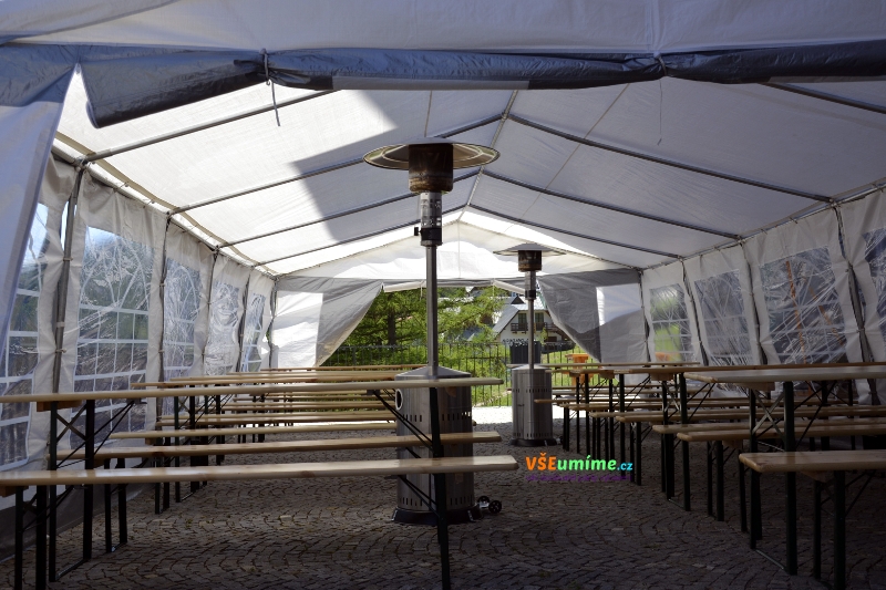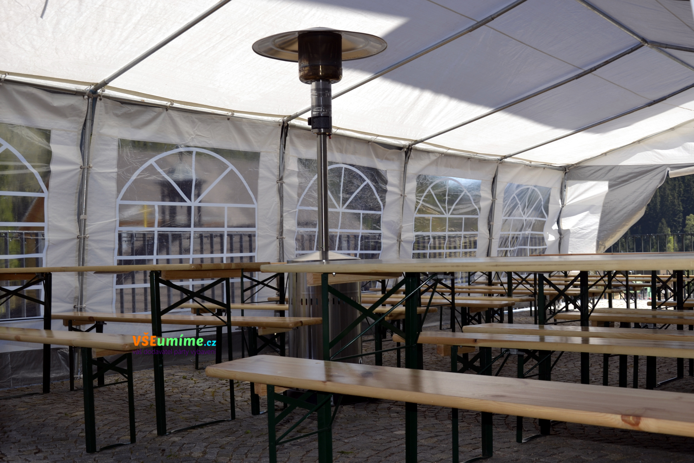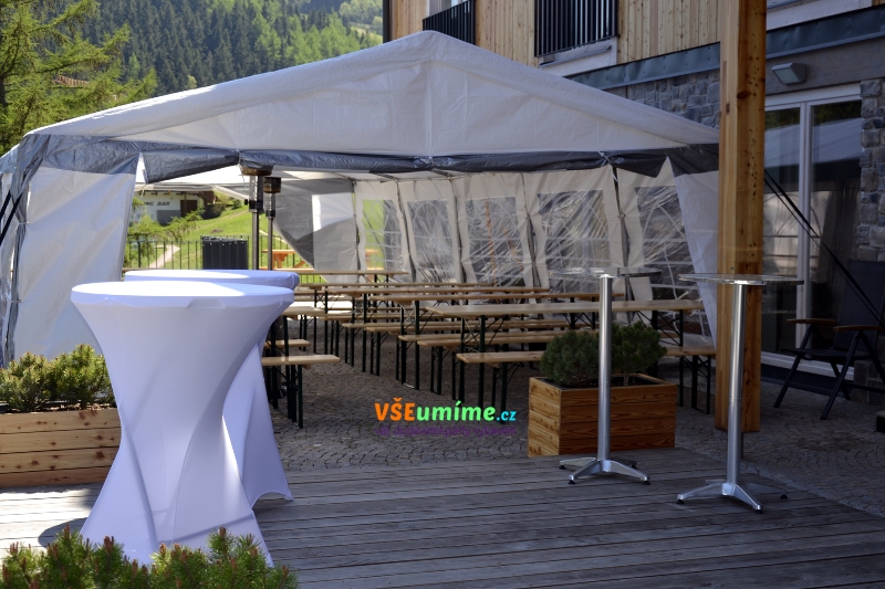 Je velmi prostorný, voděodolný, vyrobený z kvalitního a odolného polyethylenu. Party stan může být zcela uzavřen bočnicemi (v ceně pronájmu) nebo naopak bez bočnic, popř. napůl.